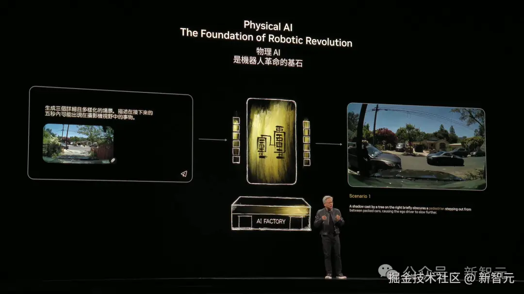 老黄举例称,一个简单的提示,物理 AI 可生成不同场景的视频以训练自动驾驶汽车。