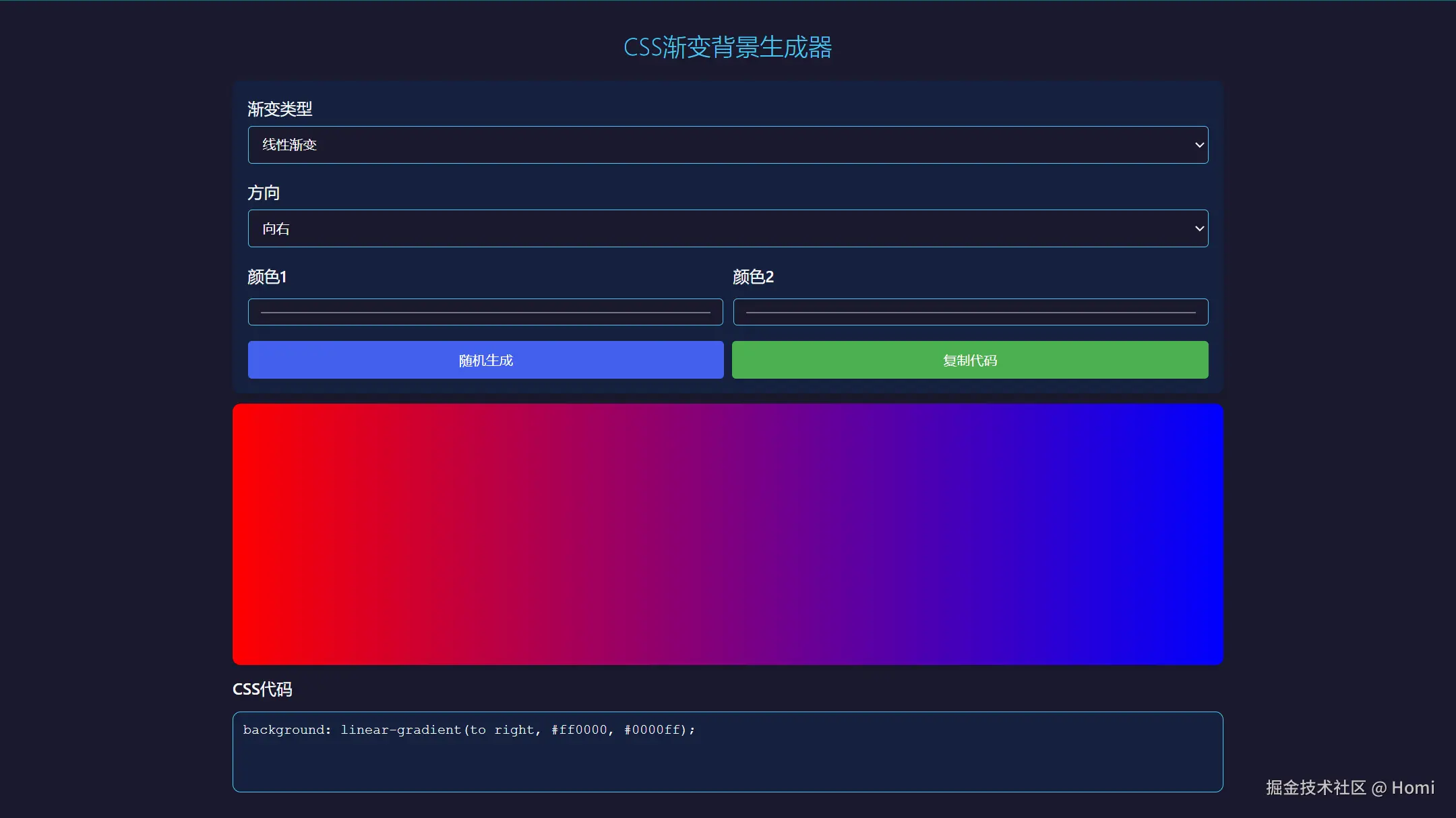 <h1>CSS渐变背景生成器</h1>