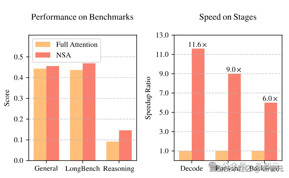 如图 1 所示,实验结果显示:采用 NSA 预训练的模型在通用基准测试、长文本处理和指令推理等多个任务上,性能均达到或超过了使用完整注意力机制的模型。