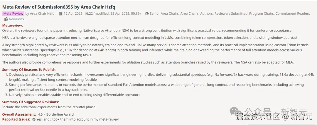 原生稀疏注意力(Native Sparse Attention,NSA)论文的 Meta Review 的 OA 分数已经确认得到了 4.5 分,这是一个相当高的分数,满分为 5 分。