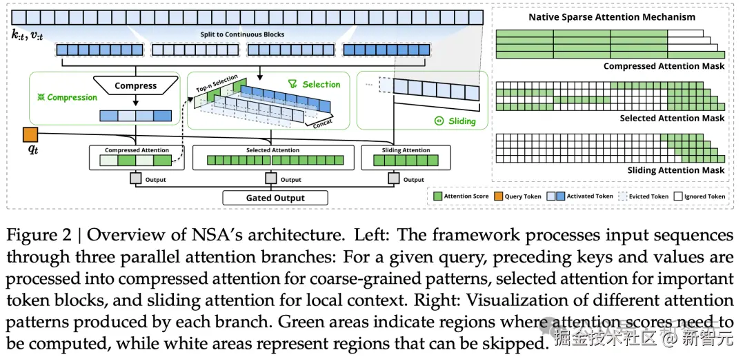 NSA 架构如下图所示,通过三条并行的注意力分支来处理输入序列。对于每一个查询(query),前面的键(key)和值(value)会分别被处理成三种不同的注意力方式: