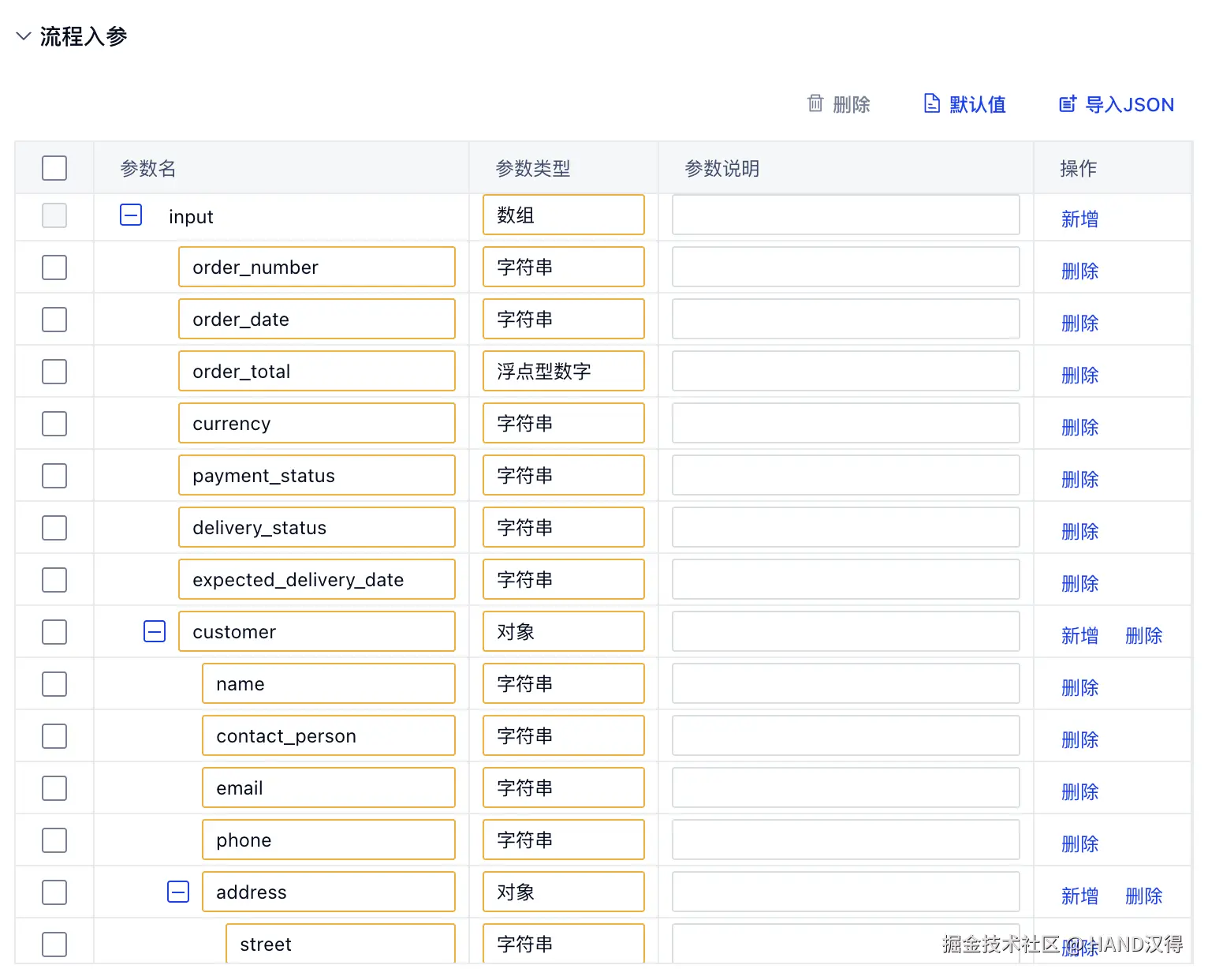 将批量订单的宽结构数组数据导入流程入参,作为结构向导,为实现无代码流程编辑打基础。
