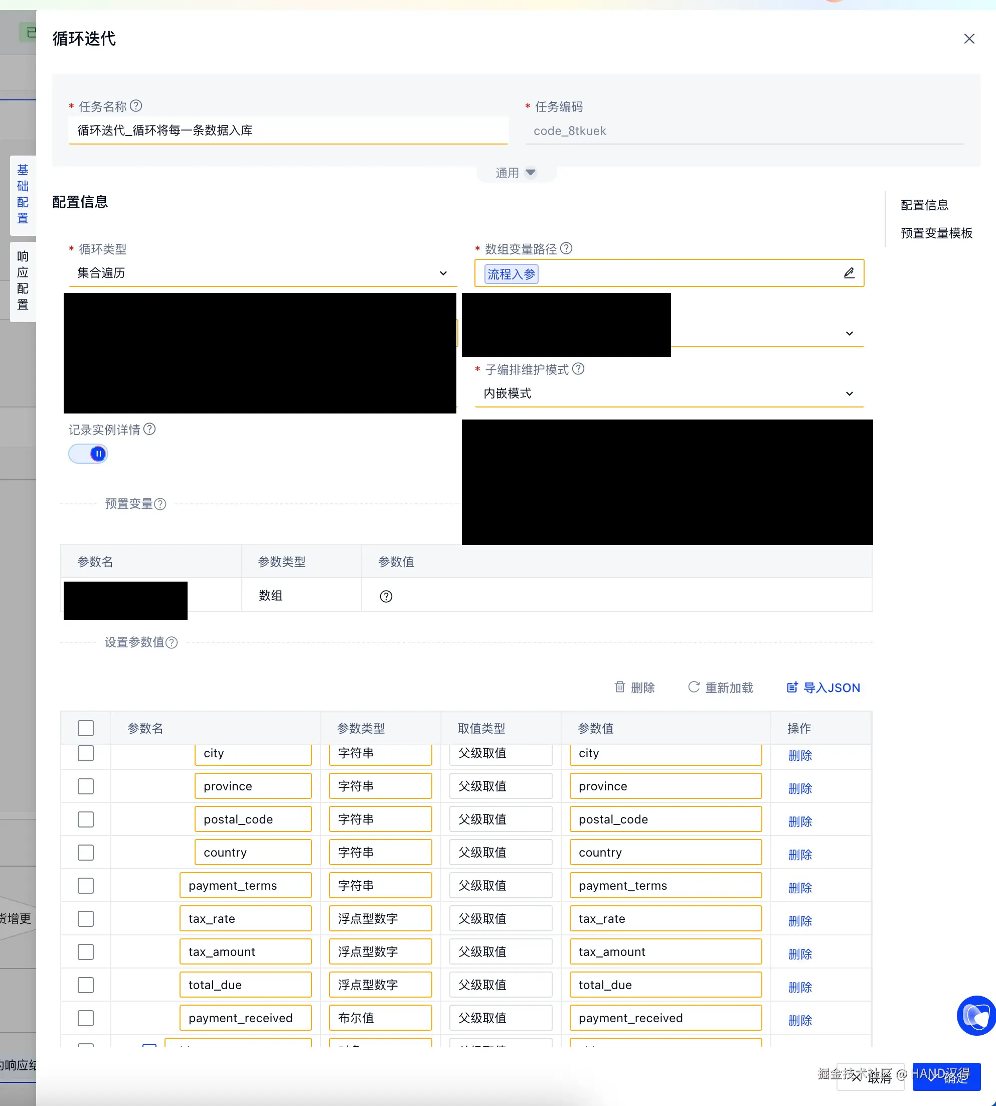 针对循环处理批订单场景,循环节点选择集合遍历类型,直接配置入参结构作为遍历目标。