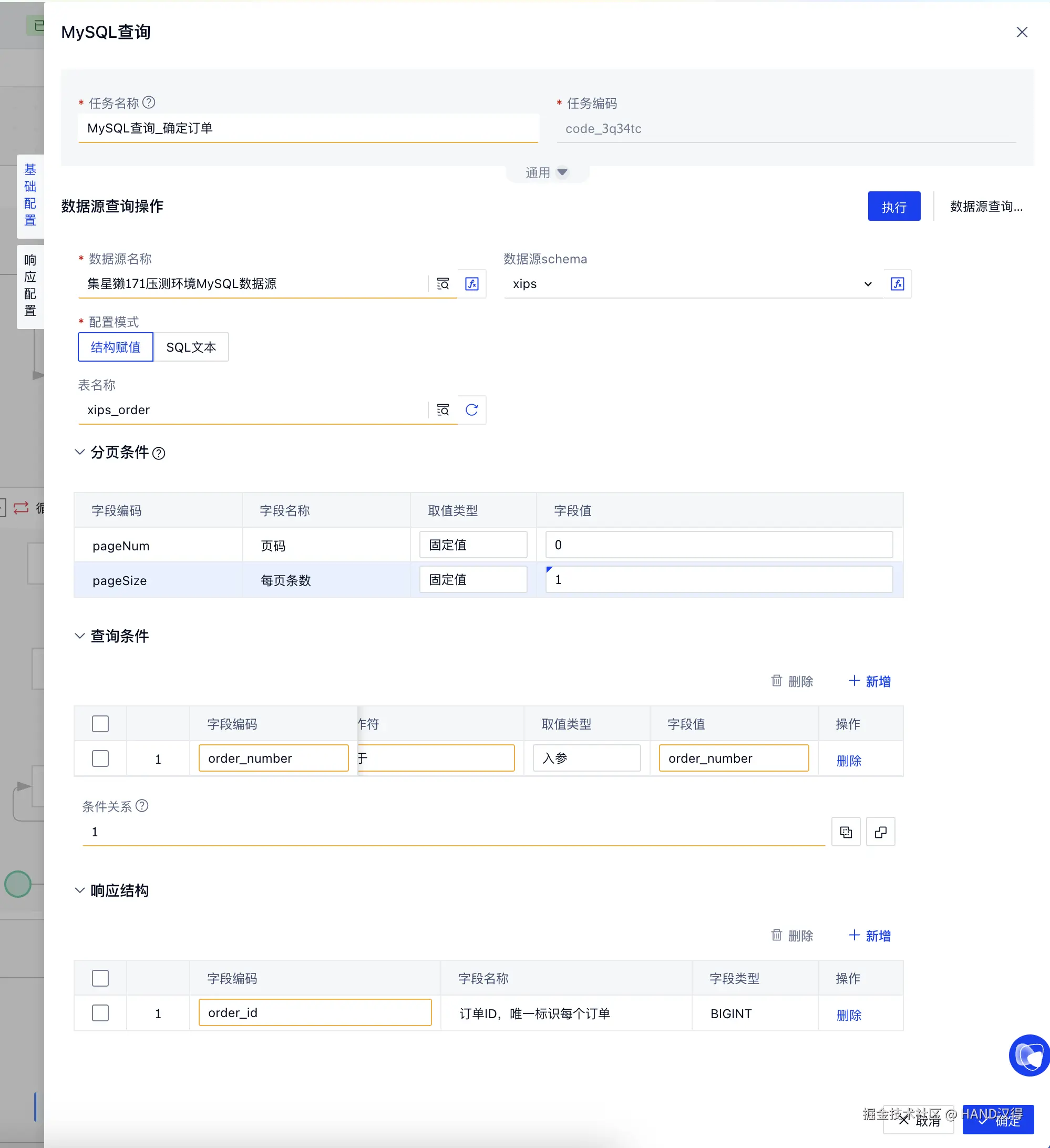 新版数据库相关节点支持配置表操作的各个属性。查询条件可直接选取流程入参的结构,可快速配置响应参数。