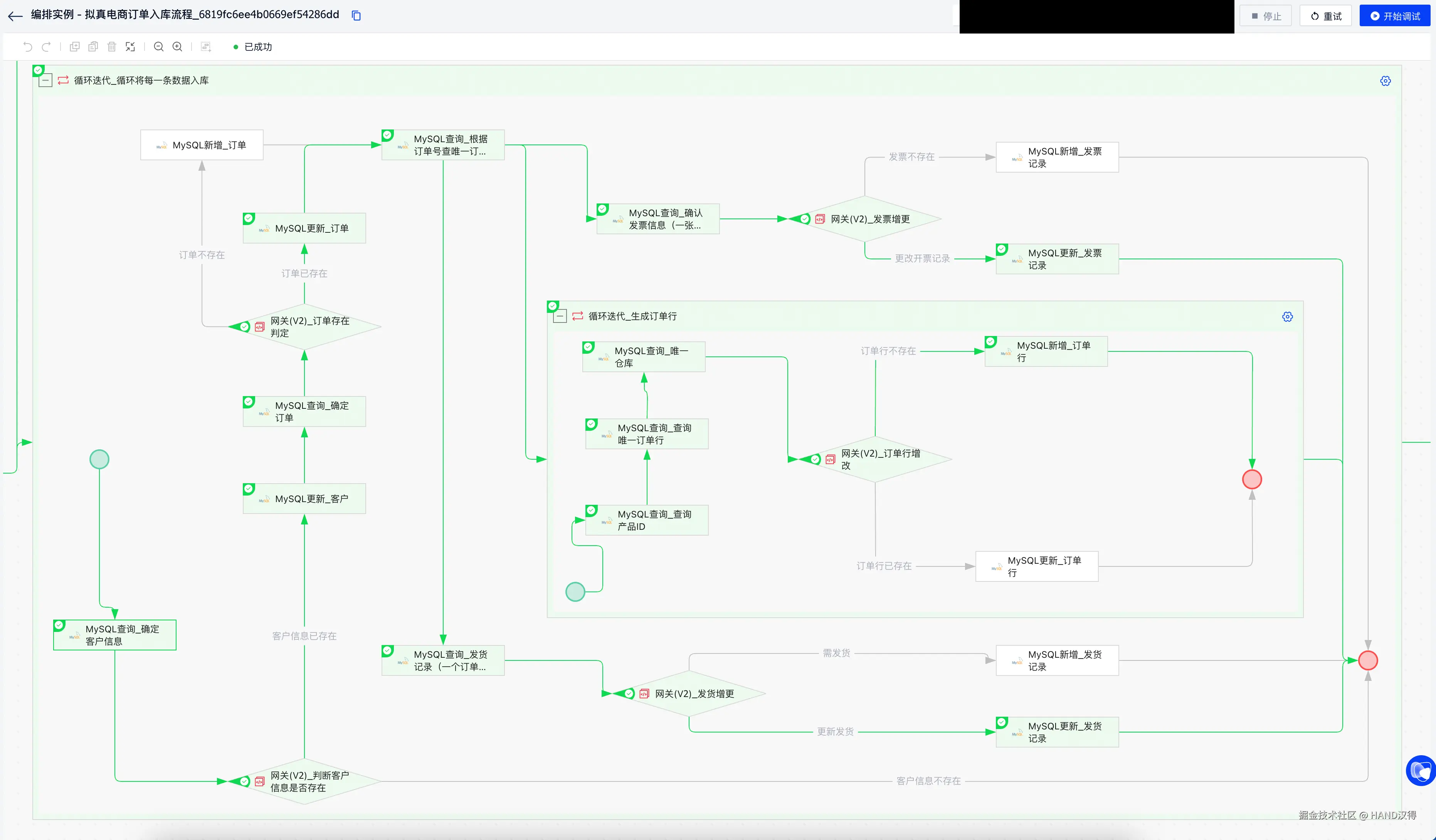新版服务编排以可视化模式驱动电商订单入库流程升级,实现订单、客户、库存、发票、发货等环节的自动化处理。流程中通过循环节点、判断逻辑与数据查询的编排,完成了低代码构建业务逻辑,极大提升订单处理效率与业务响应速度。