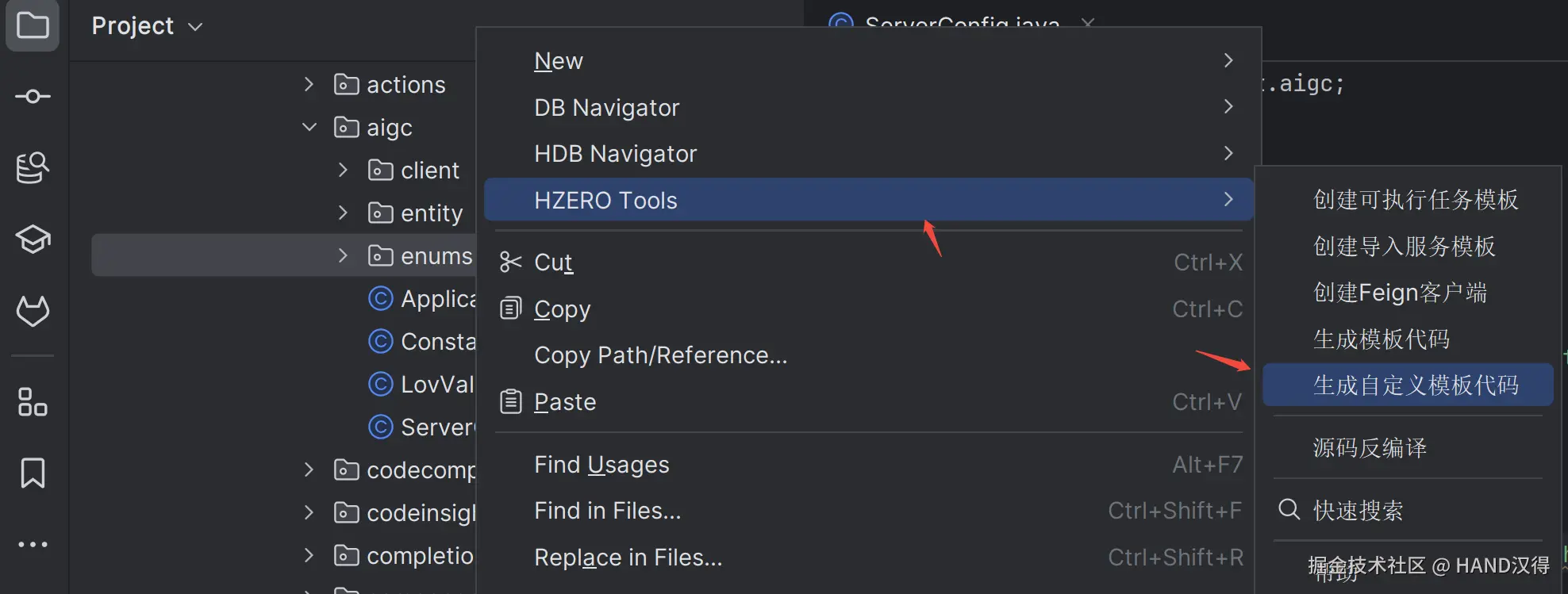 选择项目文件夹,在右键菜单中选择 HZERO Tools->生成自定义模板代码 ,即可进入脚手架生成交互页面: