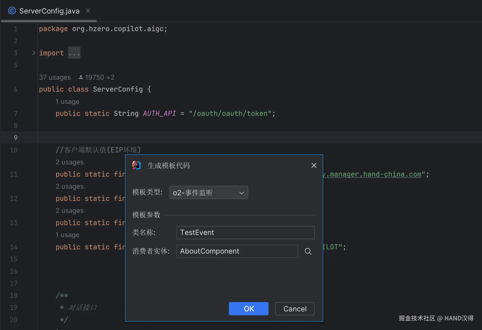 通过模板类型下拉框,在不同模板之间进行快速切换;选择不同模板后,将会动态渲染模板中的自定义参数;维护好参数后,点击确认,即可在所选目录下生成目标类骨架代码: