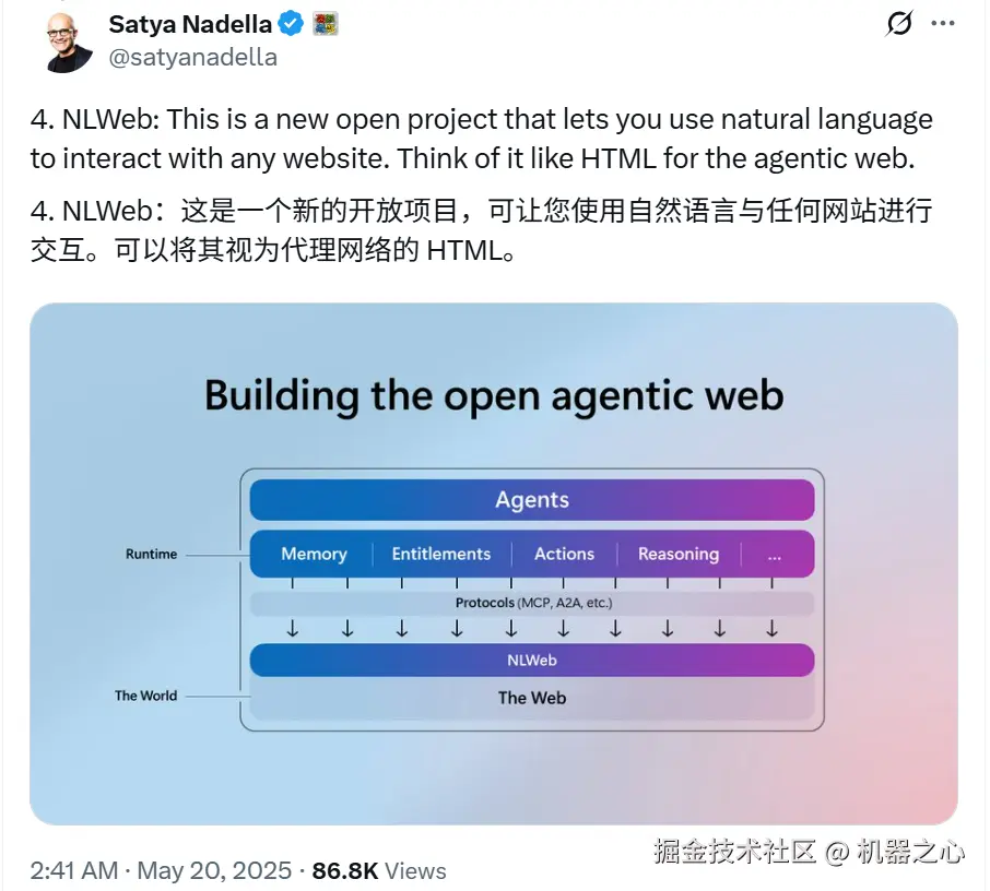 微软 CEO Satya Nadella 表示:「NLWeb 允许用户使用自然语言与任何网站进行交互。我们可以把它想象成智能体化 web 世界的 HTML。」