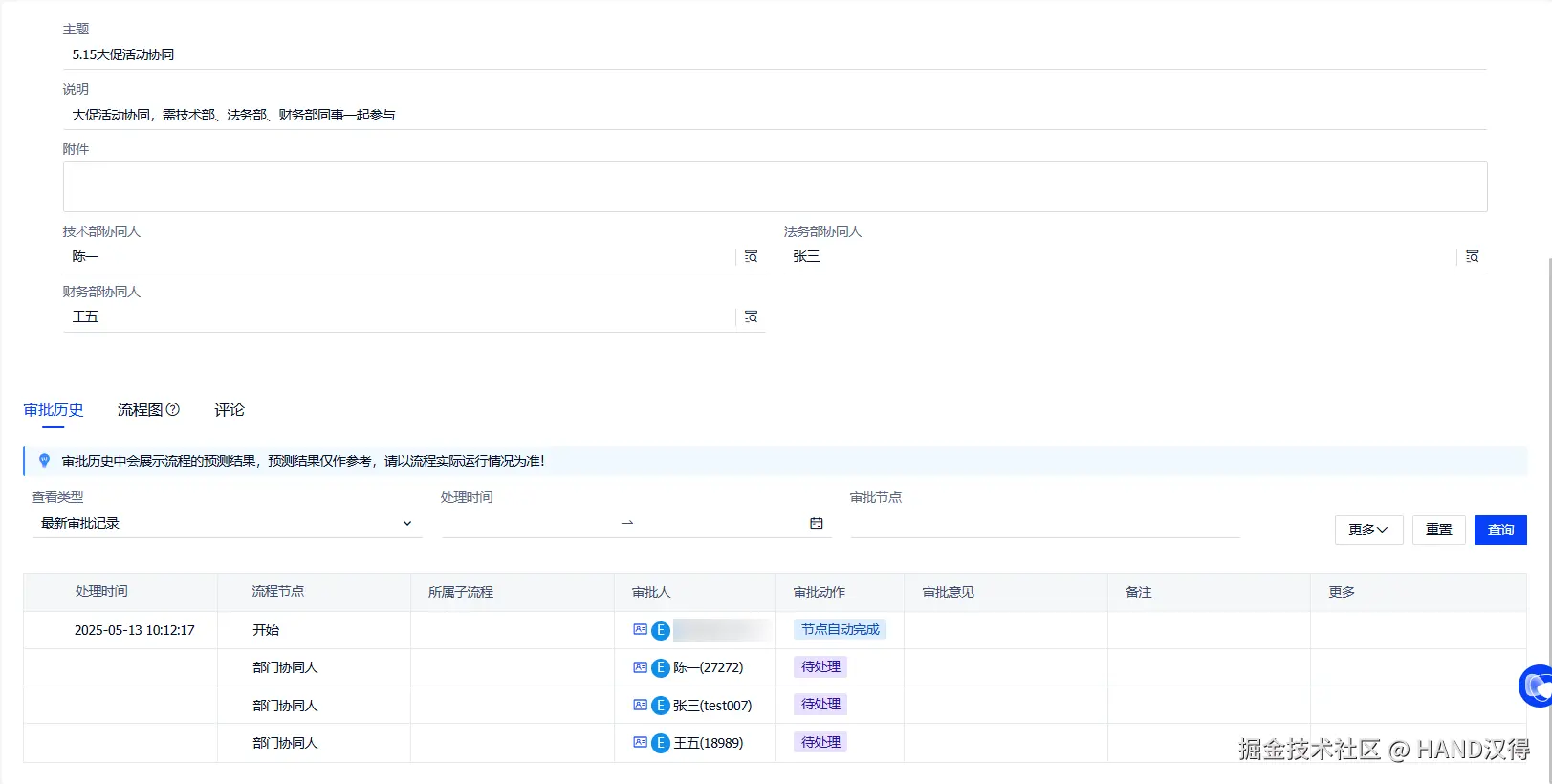 某市场部员工发起“跨部门联合营销活动”申请,需技术部、财务部、法务部协同审批。由于协作部门不固定(例如需新增设计中心参与),无法预先绑定具体审批人。