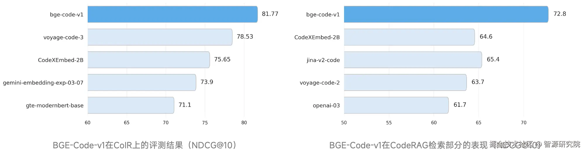 CoIR ****代码检索基准,收集了覆盖14种编程语言的4大类8个子任务,能够有效地评估模型在自然语言和代码的各类混合场景中的检索能力。CodeRAG-Bench 基准评估了代码检索模型在代码检索增强(RACG)中的表现。BGE-Code-v1在两个基准上均以显著优势超越谷歌、Voyage AI、Salesforce、Jina等商业/开源模型,登顶SOTA。