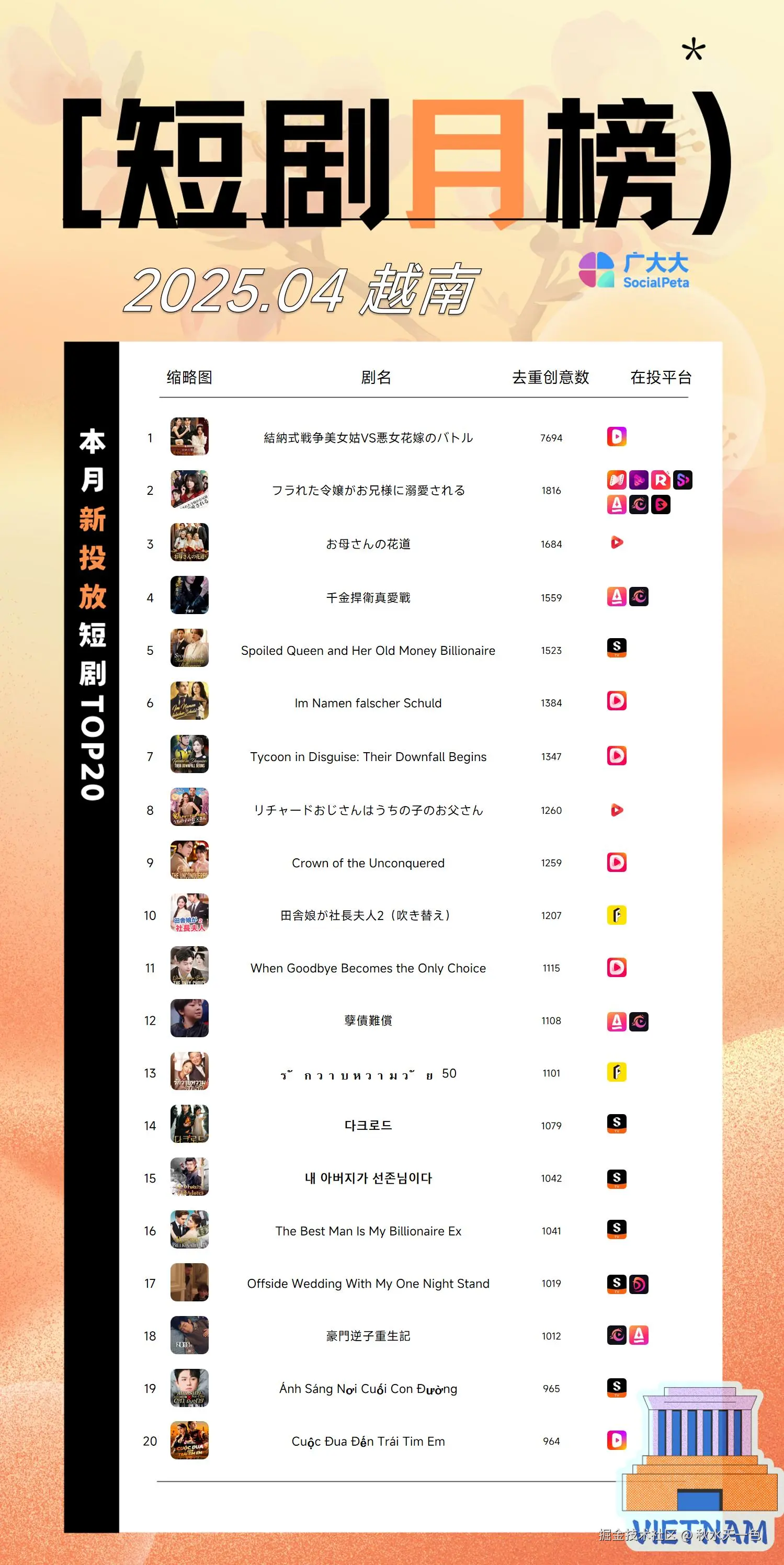 4月,越南地区榜单上大部分为中、日、韩短剧,投放平台以ShortMax和DramaBox为主。以下是我们根据 广大大-短剧-剧目榜-越南地区 数据整理出来的短剧月榜。