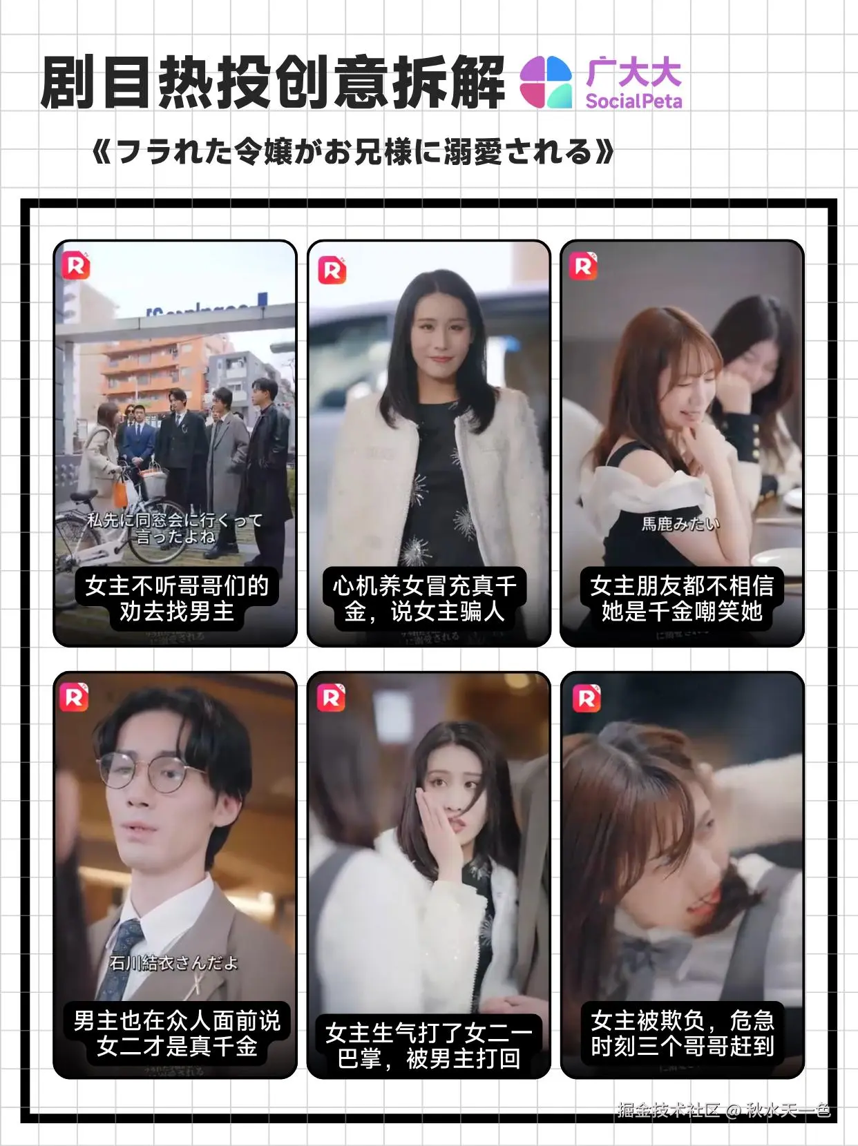 创意部分,该剧创意素材包含2-17分钟多种时长类型,能够满足多个平台特性。素材充分演绎了女主被冤枉和霸凌的前因后果,结尾钩子是女主三个哥哥前来救场的画面,在观众攒足了怒气之后戛然而止,较具吸引力。
