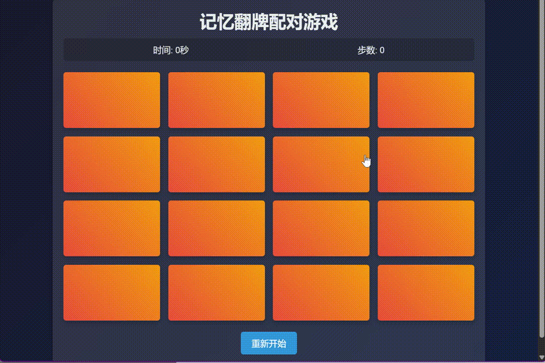 "我需要一个记忆翻牌游戏,包含计时器、步数统计、动态卡片生成、胜利弹窗..."