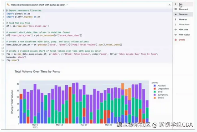 首先,你很可能会使用 AI 来生成代码或调试数据分析中的错误。这对于复杂的任务特别有用,例如可视化大型数据集和构建机器学习模型。