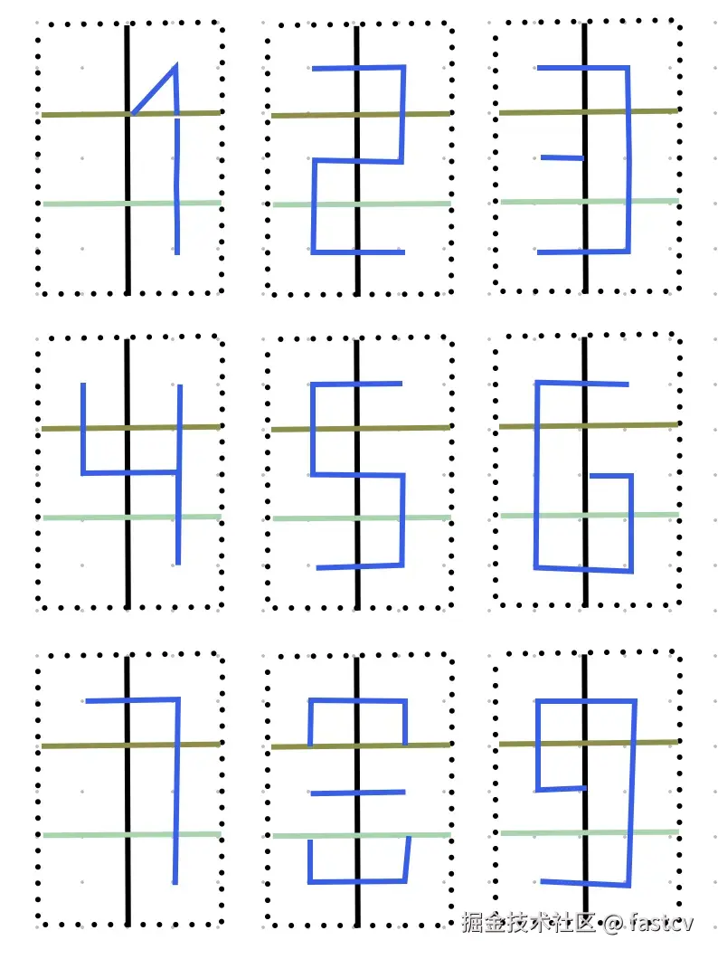 我们拿数字6举例子,我们将数字占有的坐标区域分为6个部分: