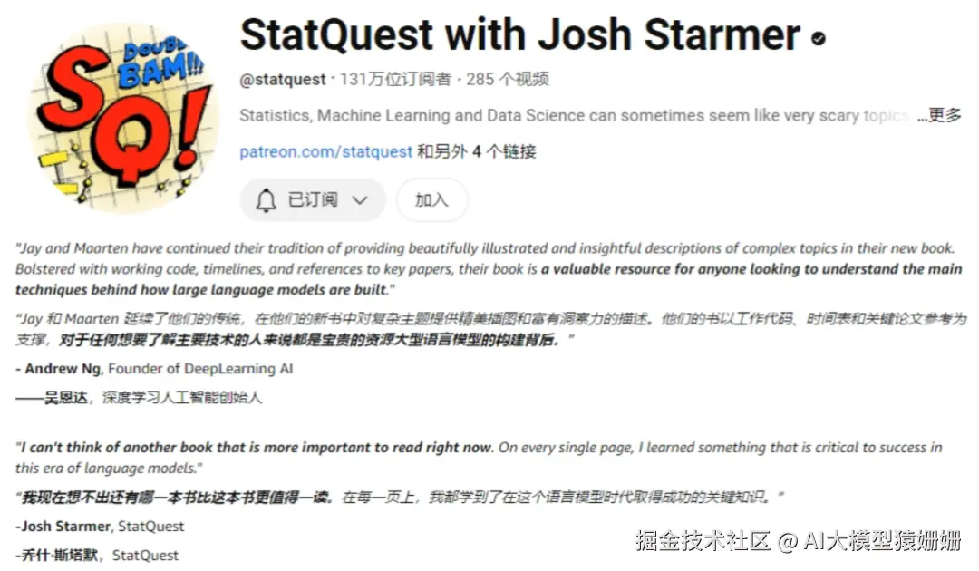 竟然有一本书能让我的两位偶像同时称赞! 吴恩达老师我就不用多介绍了,学过机器学习的基本上都认识!还有Josh Starmer ,油管上131万订阅的ML教育先驱,看过他视频的都说好!