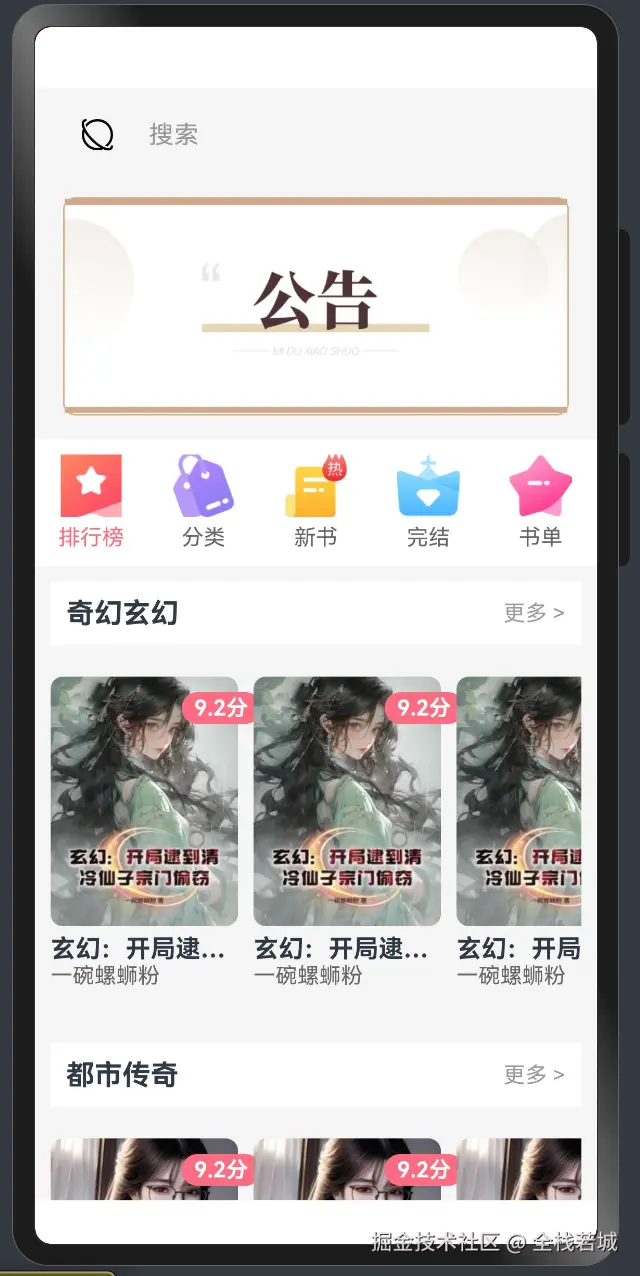 每个列表项包含了小说封面、评分标签、书名和作者信息,通过精心的样式设置,使列表项美观且信息丰富。