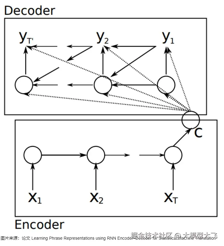 目前,处理序列转换的神经网络模型大多是编码器-解码器(Encoder-Decoder)模型。传统的RNN架构仅适用于输入和输出等长的任务。然而,大多数情况下,机器翻译的输出和输入都不是等长的,因此,对于输入输出都是变长的序列,研究人员决定使用一个定长的状态机来作为输入和输出之间的桥梁。于是人们使用了一种新的架构:前半部分的RNN只有输入,后半部分的RNN只有输出(上一轮的输出会当作下一轮的输入以补充信息),两个部分通过一个隐状态(hidden state)来传递信息。把隐状态看成对输入信息的一种编码的话,前半部分可以叫做编码器(Encoder),后半部分可以叫做解码器(Decoder)。这种架构因而被称为编码器-解码器架构,所用到的模型就是编码器-解码器模型,具体如下图所示,图中编码器和解码器通过一个中间隐状态C来完成信息交互。