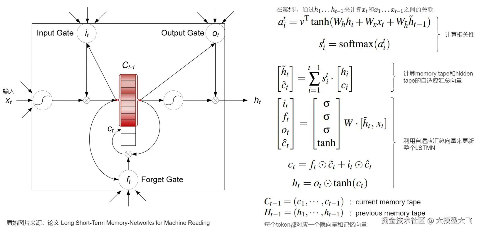 - 对于记忆压缩问题,论文设计了memory/hidden tape 来进行解决,每个token都对应一个隐藏状态向量和记忆向量。