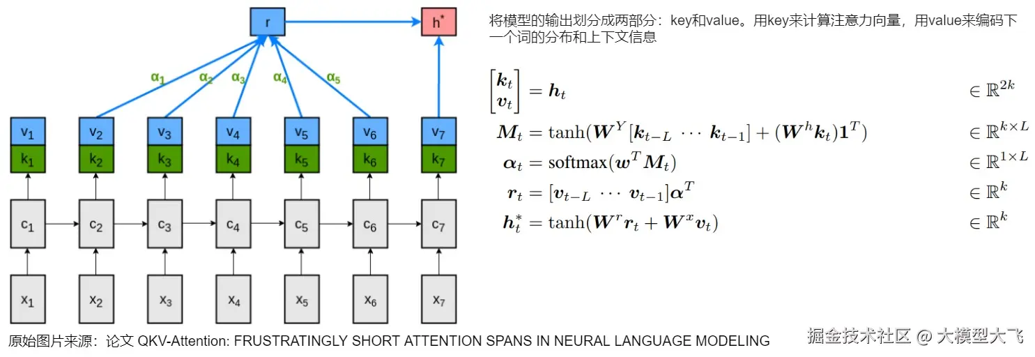 论文作者将原始模型的输出划分成两部分:key和value,用key来计算注意力向量,用value来编码下一个词的分布和上下文信息。