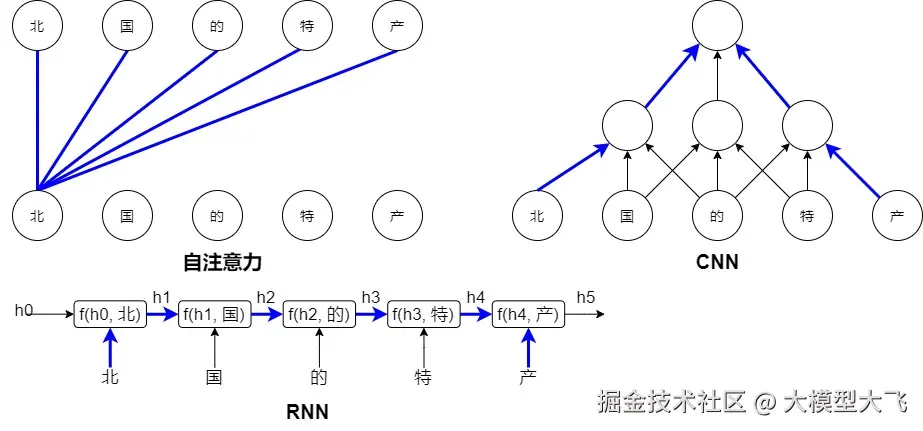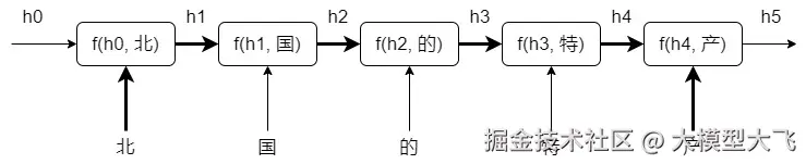 模型在第一步得到输入h0和“北”,调用函数f()进行计算,得到输出h1=f(h0, 北)。h0是第一个隐状态(通常内容是数值0或者随机值)。模型在第二步得到输入h1和“国”,同样调用函数f()进行计算,得到h2。以此类推,模型最终输出h5。在计算过程的每一步t,前面所有节点得到的信息都保存在上一步计算出来的中间隐状态ht中,因此,后一个词的计算都会用到前面所有词的输出结果。