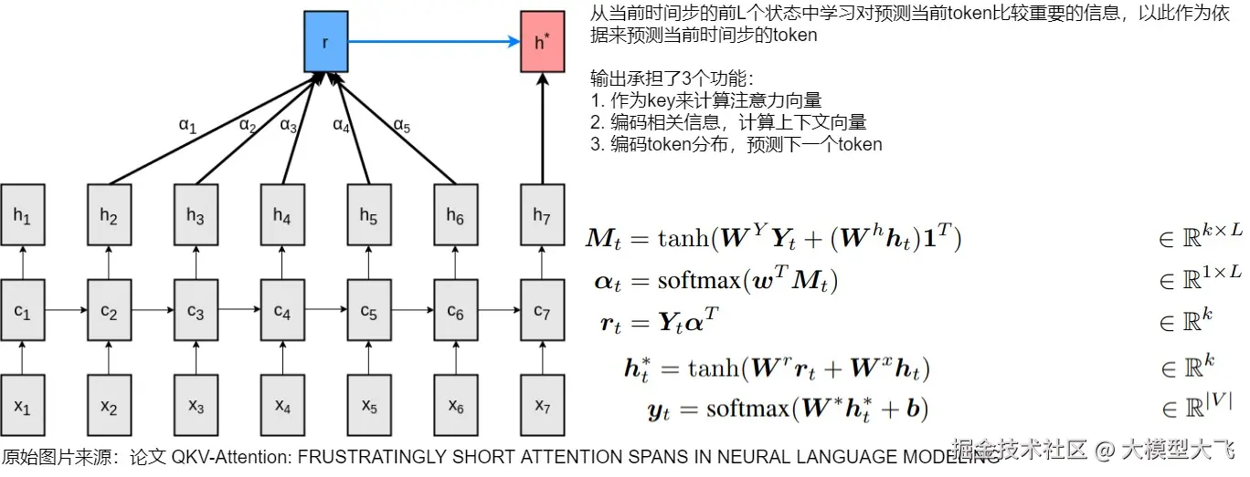作者认为目前注意力机制的隐向量承担了太多功能,这样会分身乏术,影响模型效果。因为同一个词,它在背景向量中的意义和它作为查询词时候代表的意义不同,所以要区分开来。因此该论文对每个时间步产生的输出向量进行分割成三个向量key, value, predict,各自有不同的分工。以下是修改逻辑和历程。