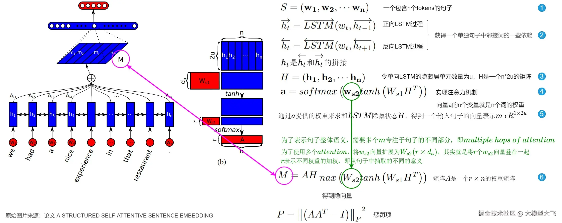 - 进行多头自注意力计算。通过将矩阵A和LSTM隐藏状态H相乘得到句子嵌入。此处的矩阵乘AH和Transformer的注意力计算方式有些近似。
