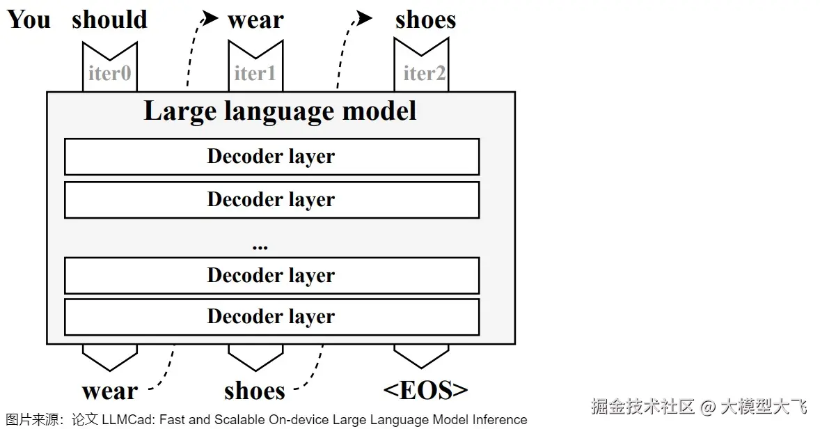 该过程中的每一步预测都需要依赖上一步预测的结果,且从第二轮开始,前后两轮的输入只相差一个 token。