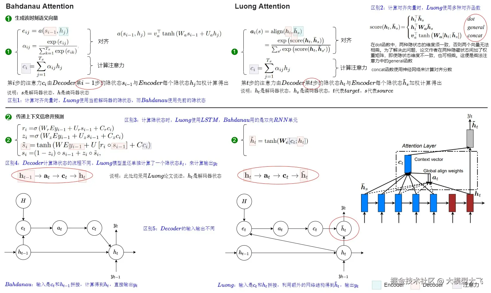 基本模块不同。计算隐状态时,Luong Attention使用LSTM,Bahdanau Attention用的是双向RNN单元。