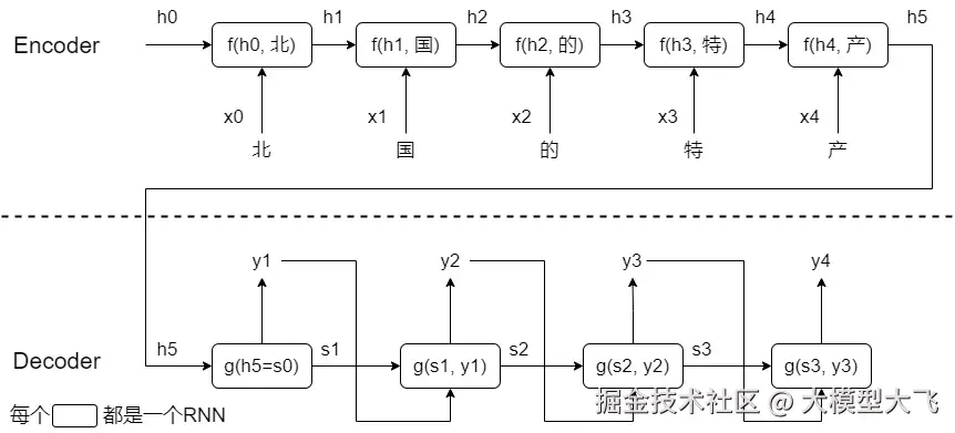 事实上,在Transformer出现之前,编码器和解码器通常是由RNN或其变体(如 LSTM 或 GRU)组成的。我们先看看如何用RNN实现编码器。以下图为例,编码器需要把“北国的特产”这个句子编码成隐状态。图中的每个方块都是一个简单的RNN单元。每个RNN单元接收两个输入(输入词和隐状态),输出一个隐状态。