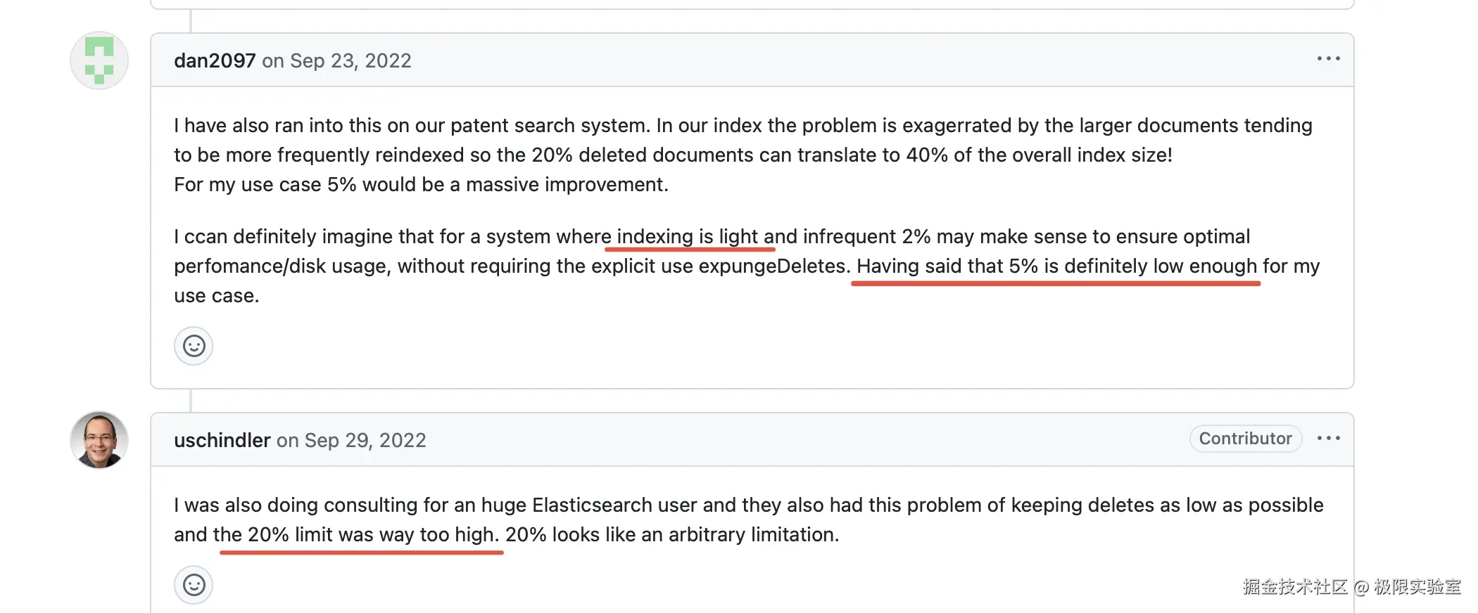 通过这个帖子的讨论,大家可以发现,“实践出真知”,这次的参数调整是 lucene 社区对于用户积极反馈的采纳。因此,对于老版本的用户,也可以在 deletepct 比较高的场景下,调优这个参数,当然一切生产调整都需要经过测试。