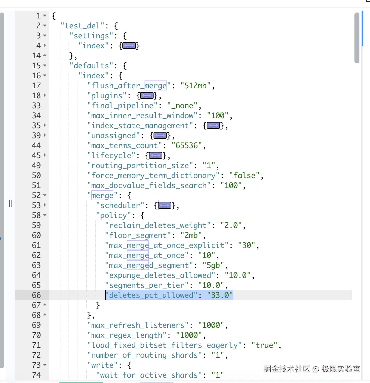 但是这些软删除文档又不是永久存在的,deletePctAllowed 表示索引中允许存在的软删除文档占总文档数的最大百分比。