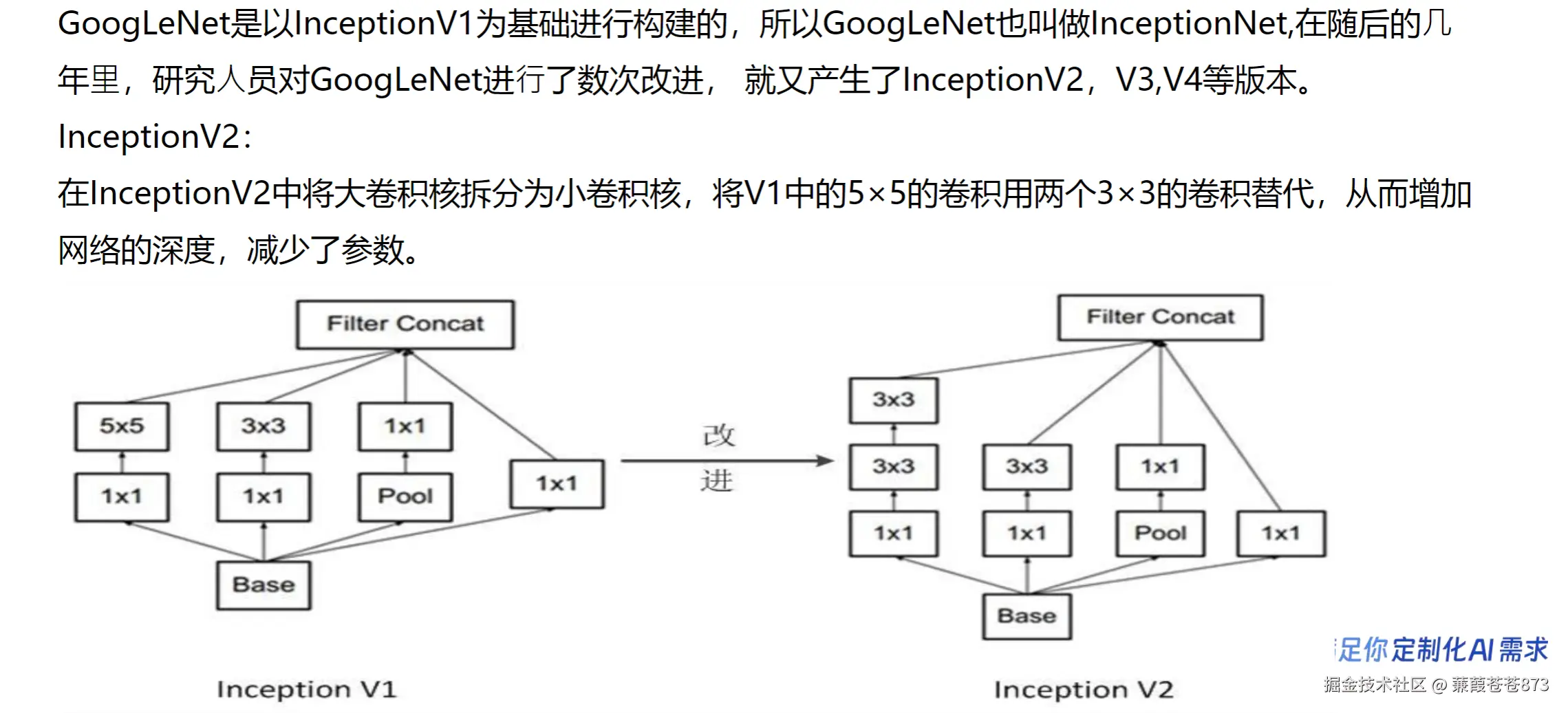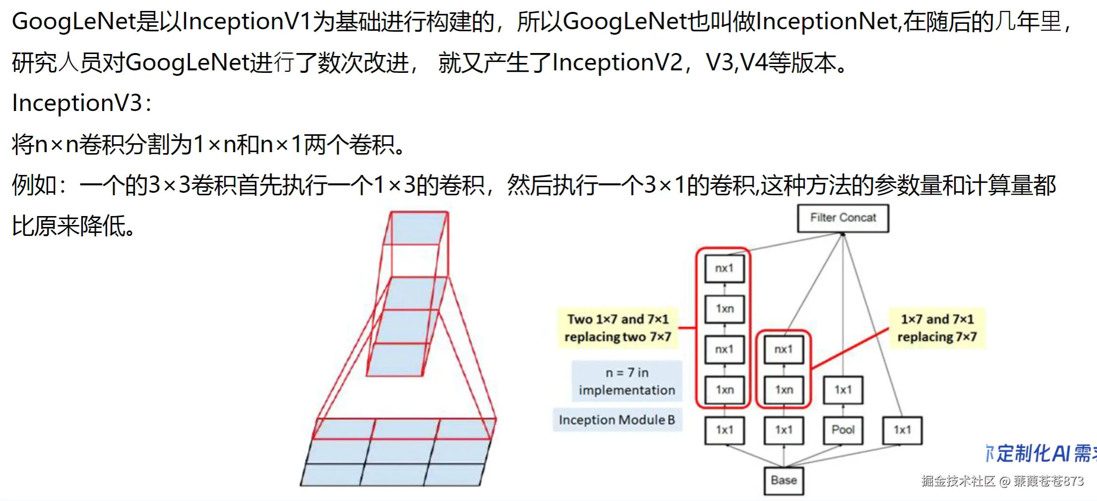 使用5×5的卷积核需要 学习25个参数才可以输出一个图像,而使用2个3×3的卷积核只需要18个参数就可以获得超越5×5的卷积核所输出的效果,拿到了同样的输出的大小,但是参数量减少了30%。