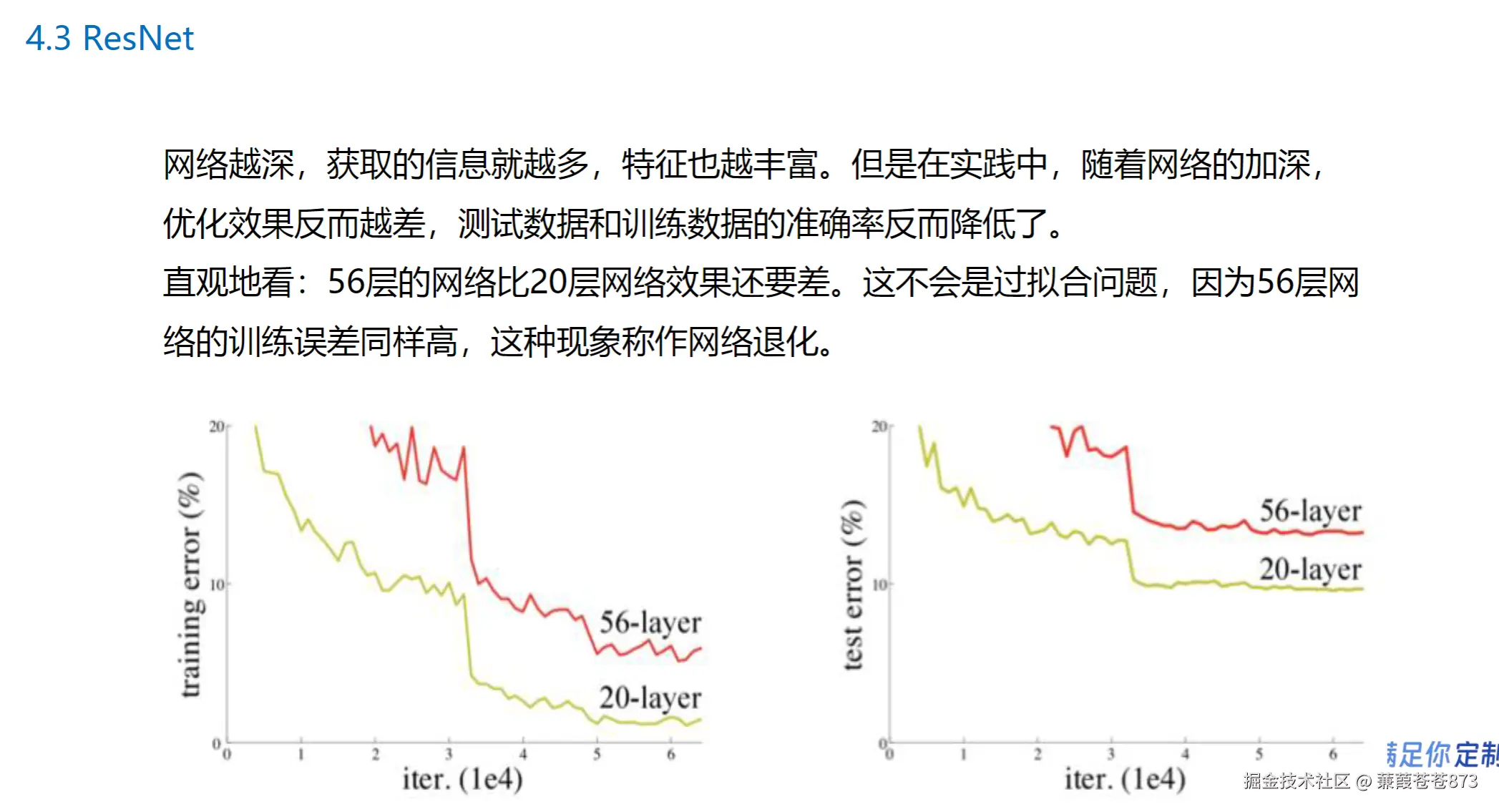 • 右图显示了测试误差(test error)随迭代次数的变化。同样,56层网络的测试误差最终高于20层网络,这表明56层网络在测试集上的表现更差。