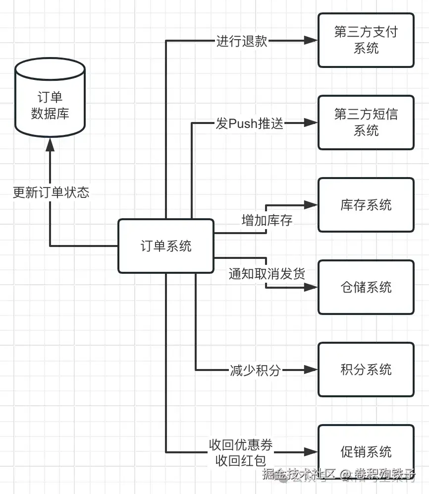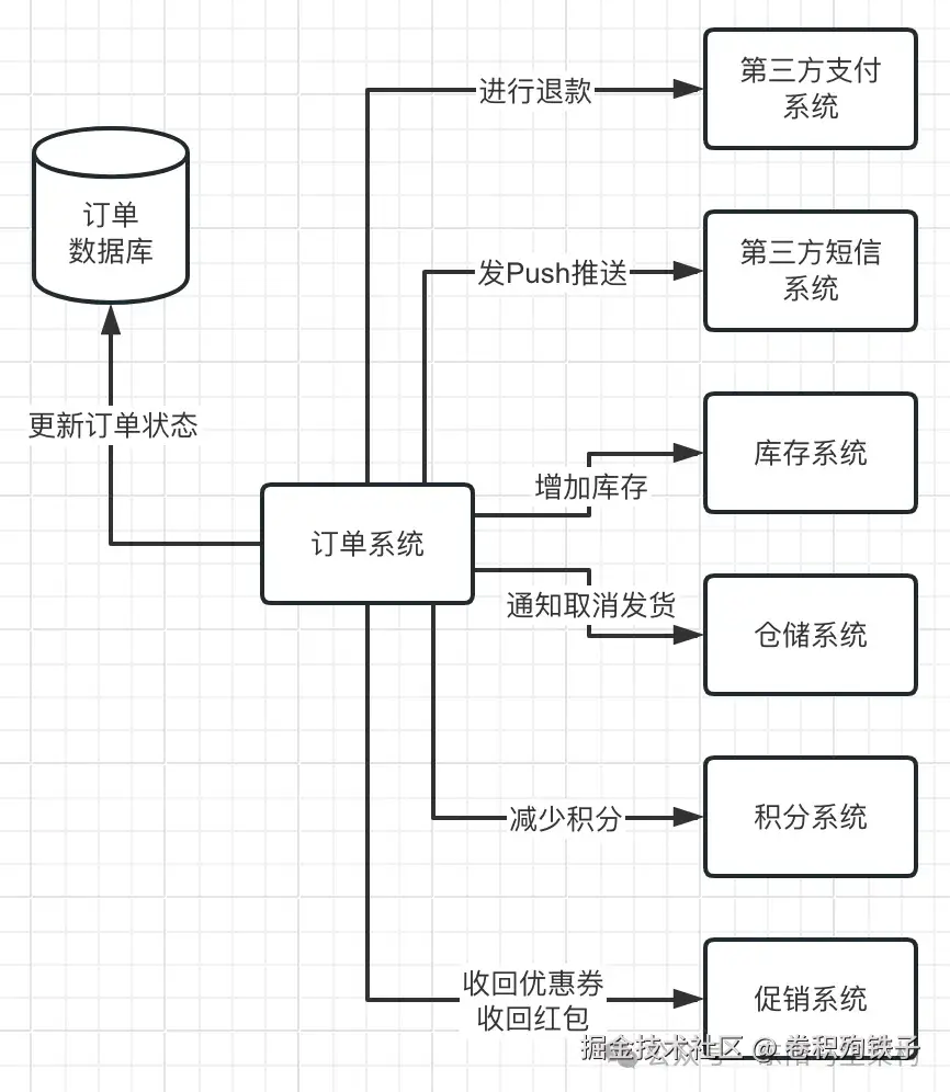 如果用户要退款,此时会涉及公司内部系统的一系列回滚。比如更新订单状态、增加库存、收回优惠券和红包、减少积分,通知取消发货等。而且还要调用第三方支付系统进行退款,万一退款失败,那么可能就会出现订单状态和钱款不一致。
