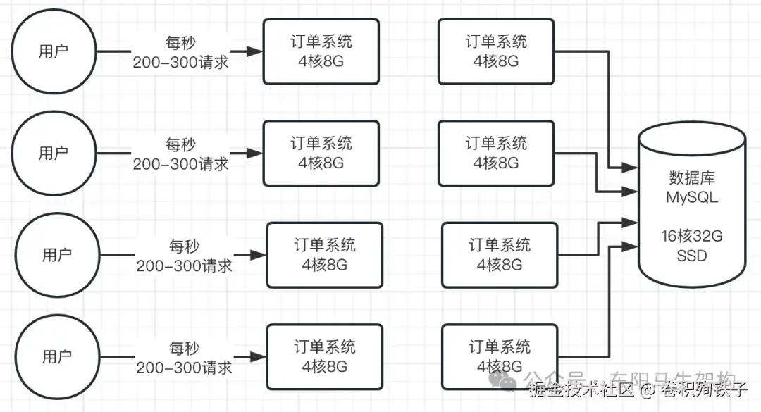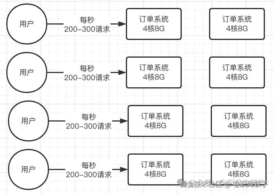 假设现在线上的订单系统一共部署了8台机器,每台机器的配置是4核8G,这是互联网公司的标准配置。当然也有不少系统是用2核4G的机器部署的,那也是标准配置。因此高峰期每台机器的请求大概是每秒200~300。