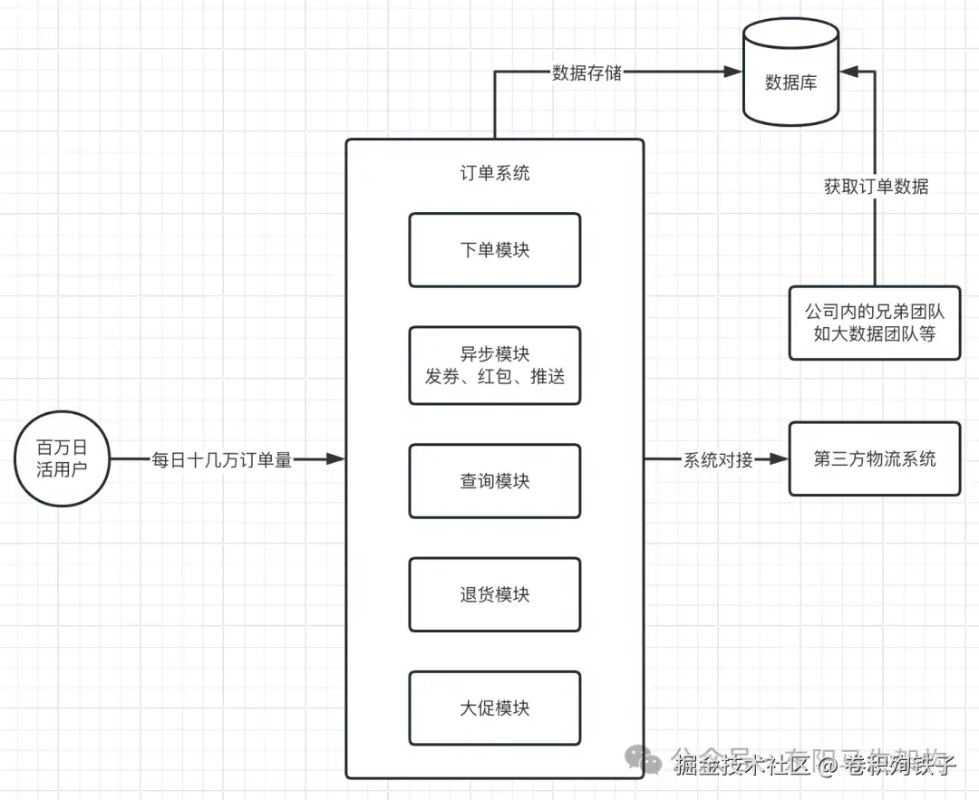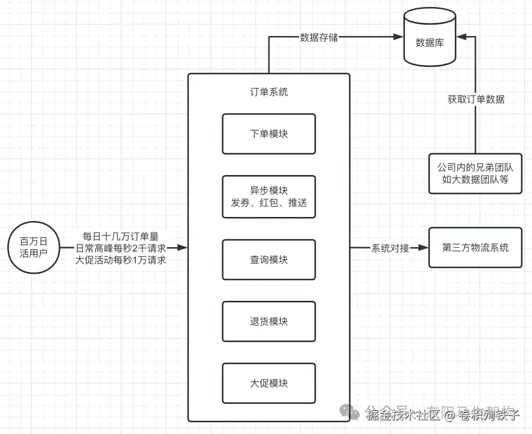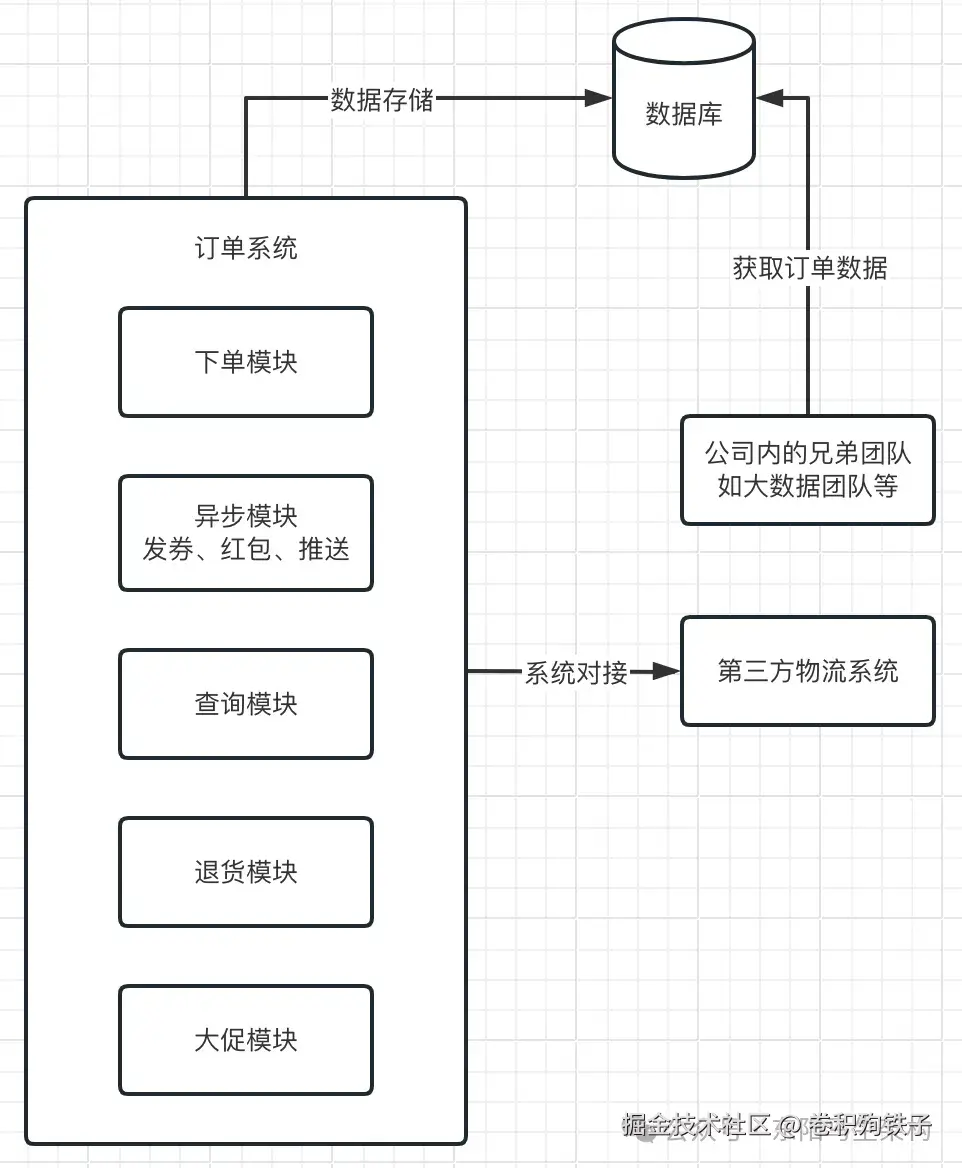 此外,订单系统除了自己要提供的功能模块外,还需要跟第三方系统进行对接。比如想要查看订单的配送状态,那么就需要订单系统从第三方物流公司的系统中进行查询。比如运营团队需要根据订单数据进行业务分析,那么就需要订单系统提供订单数据给大数据团队进行报表生成。