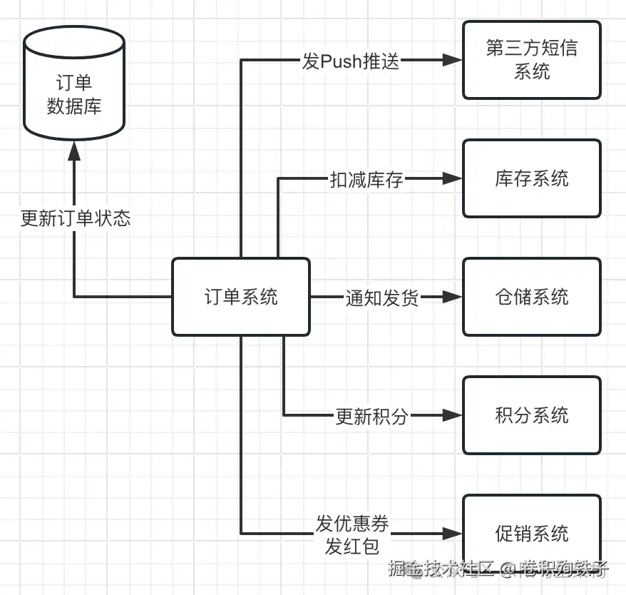 接着,订单系统会去做一些事情,比如扣减商品的库存、更新订单的状态、给用户发放优惠券、发放红包或者积分、给用户发送推送通知用户订单已经支付正在等待出库。