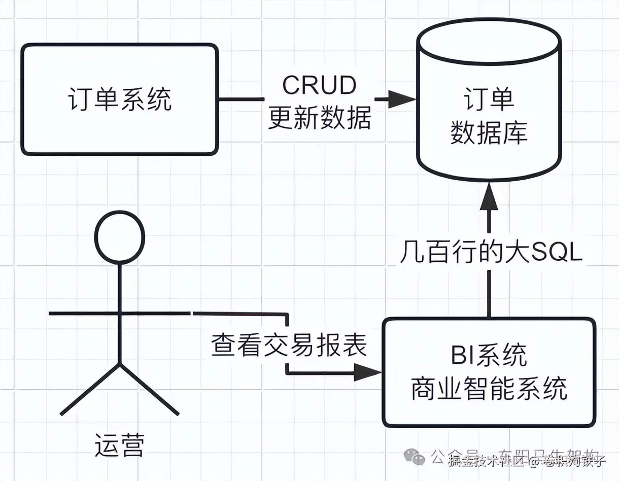 由于目前订单数据库是直接对外暴露的,大数据团队可以直接访问订单数据库。他们有一个数据报表系统,运营每次查看交易报表时,会直接用一个几百行的大SQL,从订单数据库里查数据。