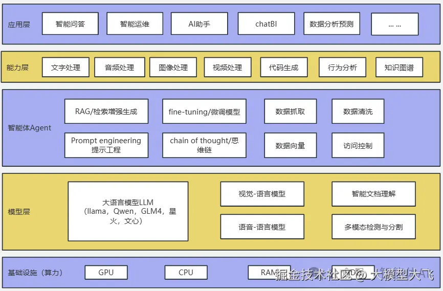 基础设施是AI架构的底层支撑,提供计算和存储资源,确保系统的运行效率。主要包括: