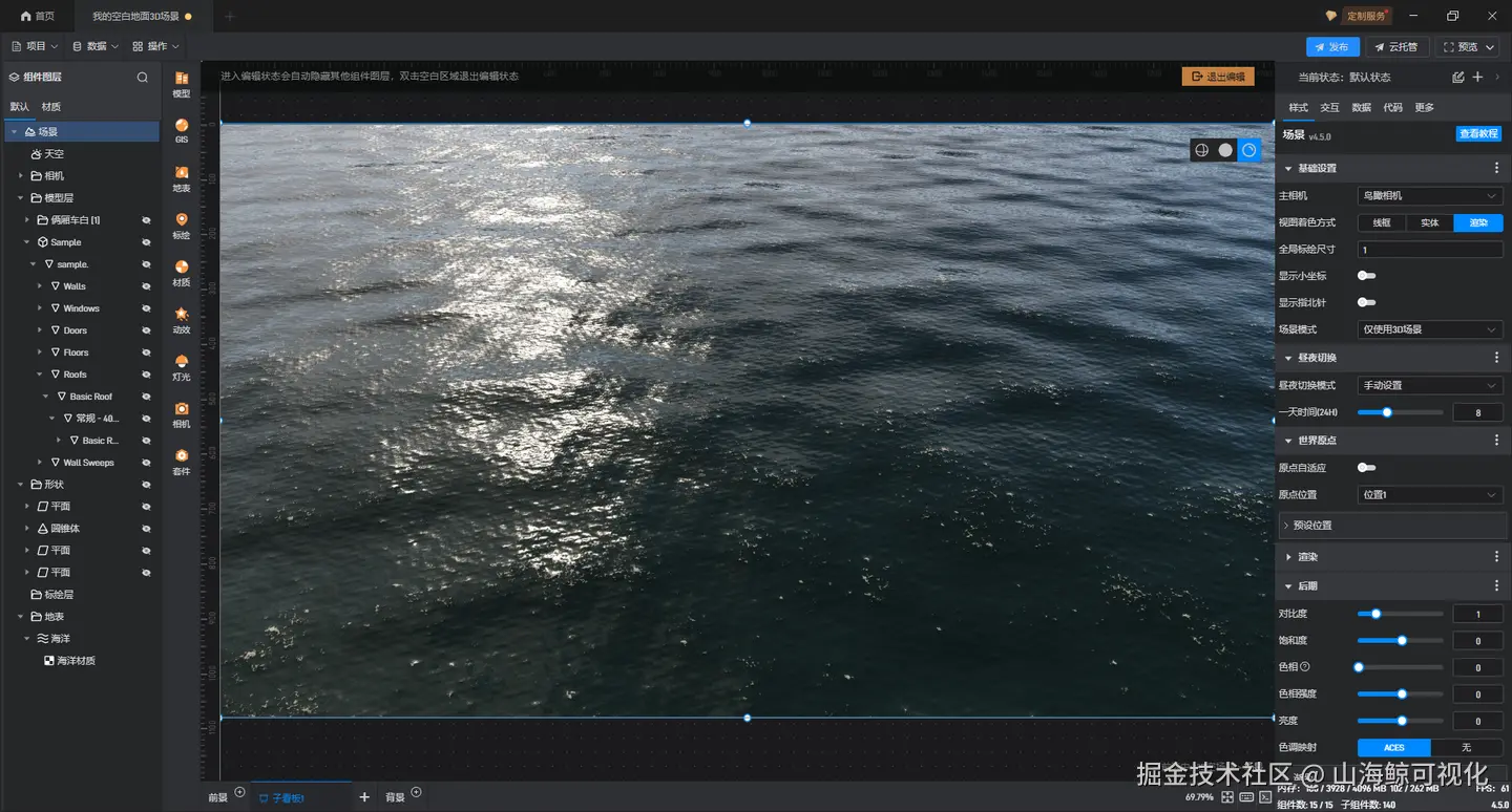 实际基于凹凸贴图的水,只需要将整个水面抬高,就可以一定程度的模拟到洪水的效果,我们可以看下山海鲸这一篇水面结合数据的水体淹没的教程案例: