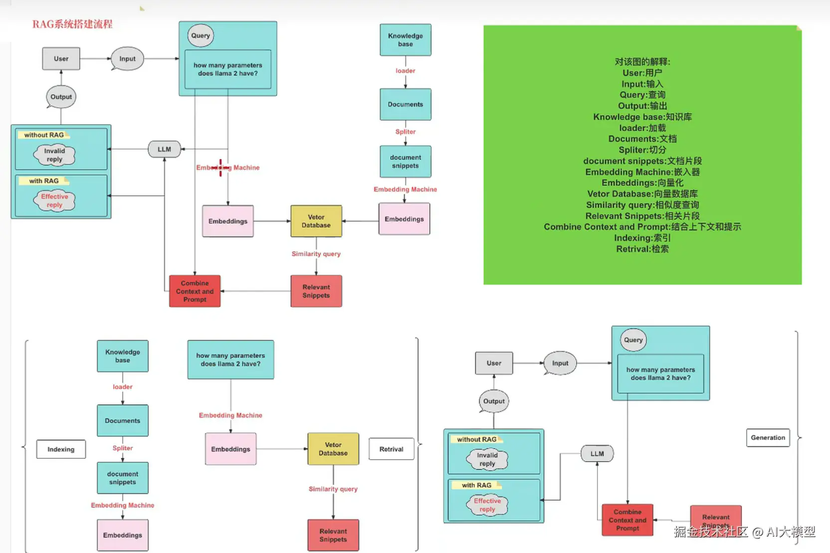 RAG具体实现流程:加载文件 => 读取文本 => 文本分割 =>文本向量化 =>输⼊问题向量化 =>在文本向量中匹配出与问题向量最相似的 top k 个 =>匹配出的文本作为上下文和问题⼀起添加到 prompt 中 =>提交给 LLM 生成回答