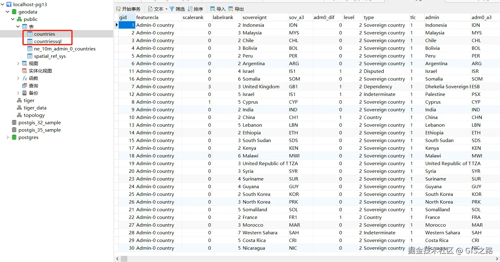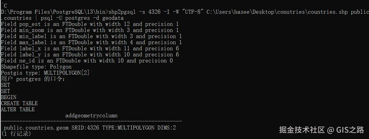 shp2pgsql -s 4326 -I -W "UTF-8" C:\Users\hasee\Desktop\conutries\countries.shp public.countries | psql -U postgres -d geodata