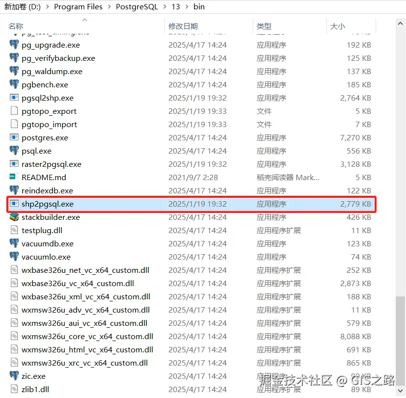 shp2pgsql则是与PostGIS工具集成在一起,无需单独下载。该命令行工具可以在安装路径下的bin目录中找到。