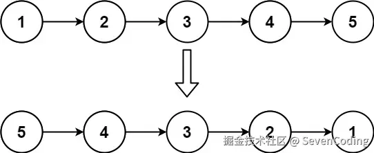 之前链表的头节点是元素1, 反转之后头结点就是元素5 ,这里并没有添加或者删除节点,仅仅是改变next指针的方向。