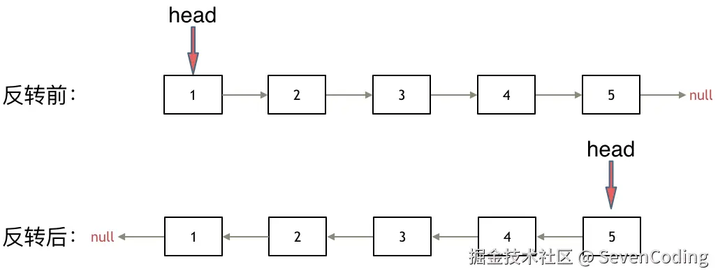 其实只需要改变链表的next指针的指向,直接将链表反转 ,而不用重新定义一个新的链表,如图所示: