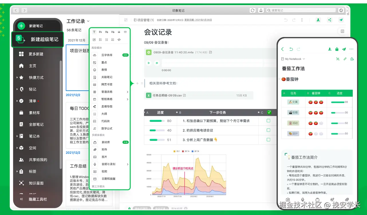 印象笔记是一款强大的信息收集和整理工具。在会议中,你可以将会议的音频、文字记录、相关资料等全部保存到印象笔记中。