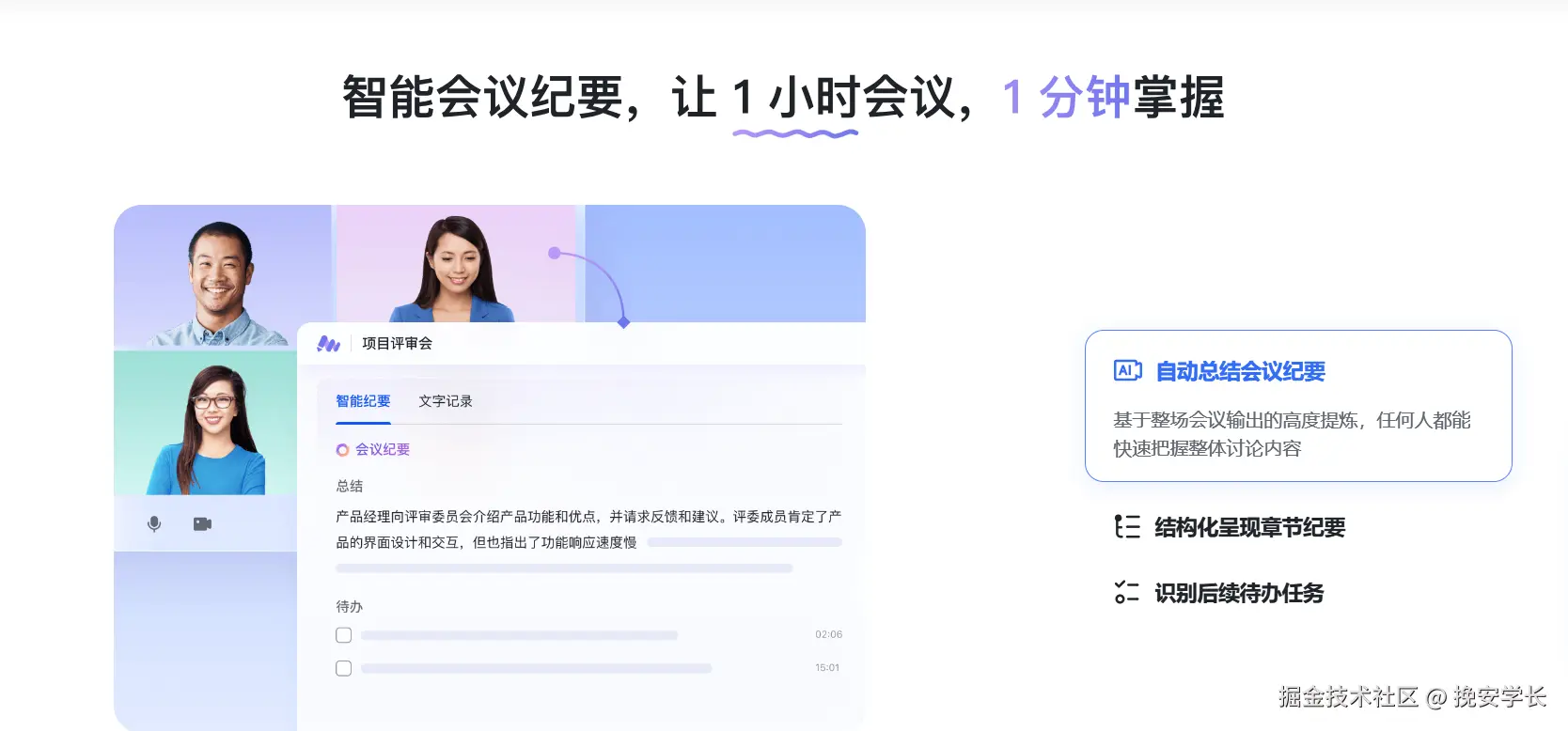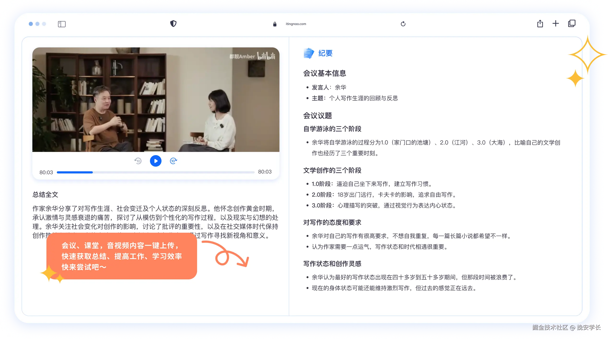 能够实现会议录音转文本、自动区分发言人、生成会议纪要、摘要和待办事项等功能。只需要将录音上传或者复制视频链接进去,就能一键全自动生成会议纪要。用他来生成会议纪要最方便了。