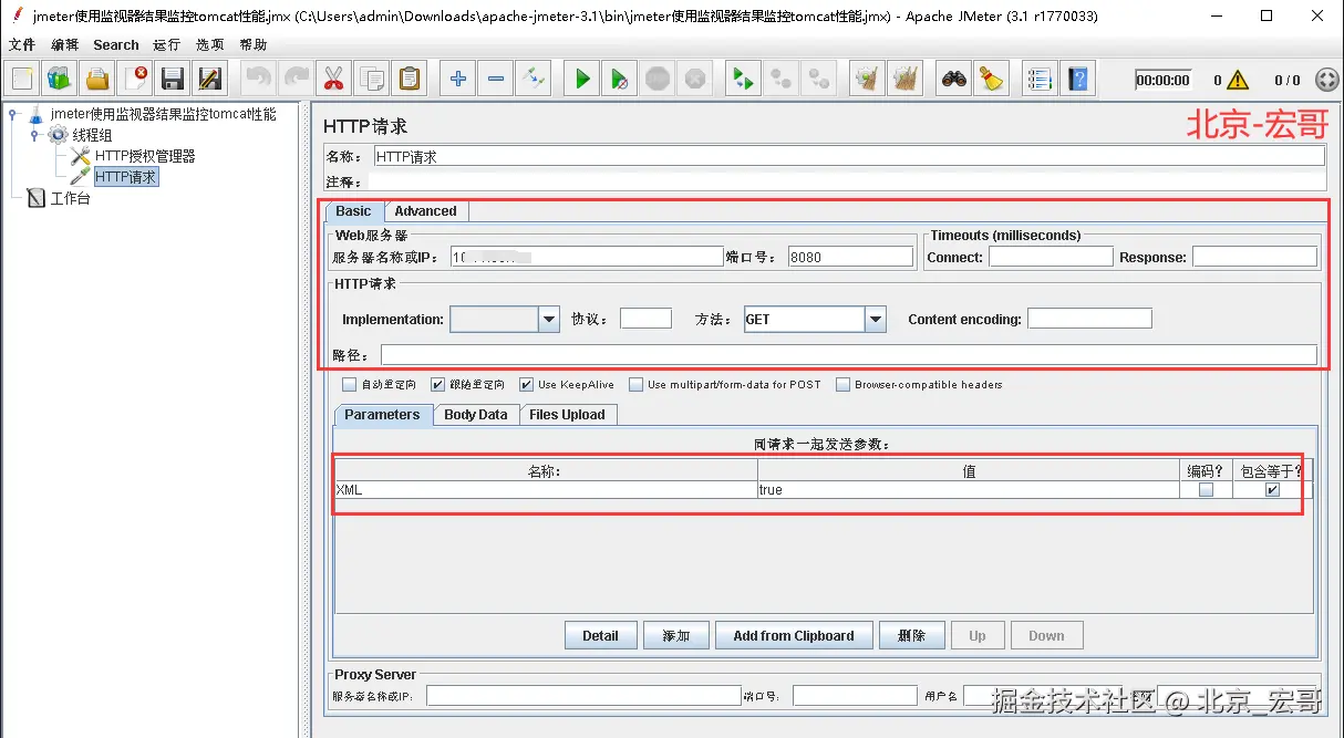 3、正确填写tomcat所在服务器IP和tomcat端口号,在“路径”中填入manager/status,请求参数,名称为“XML”(注意是大写 ),值为“true”,并且在Advanced中勾选用作监视器(必须勾选);如下图所示: