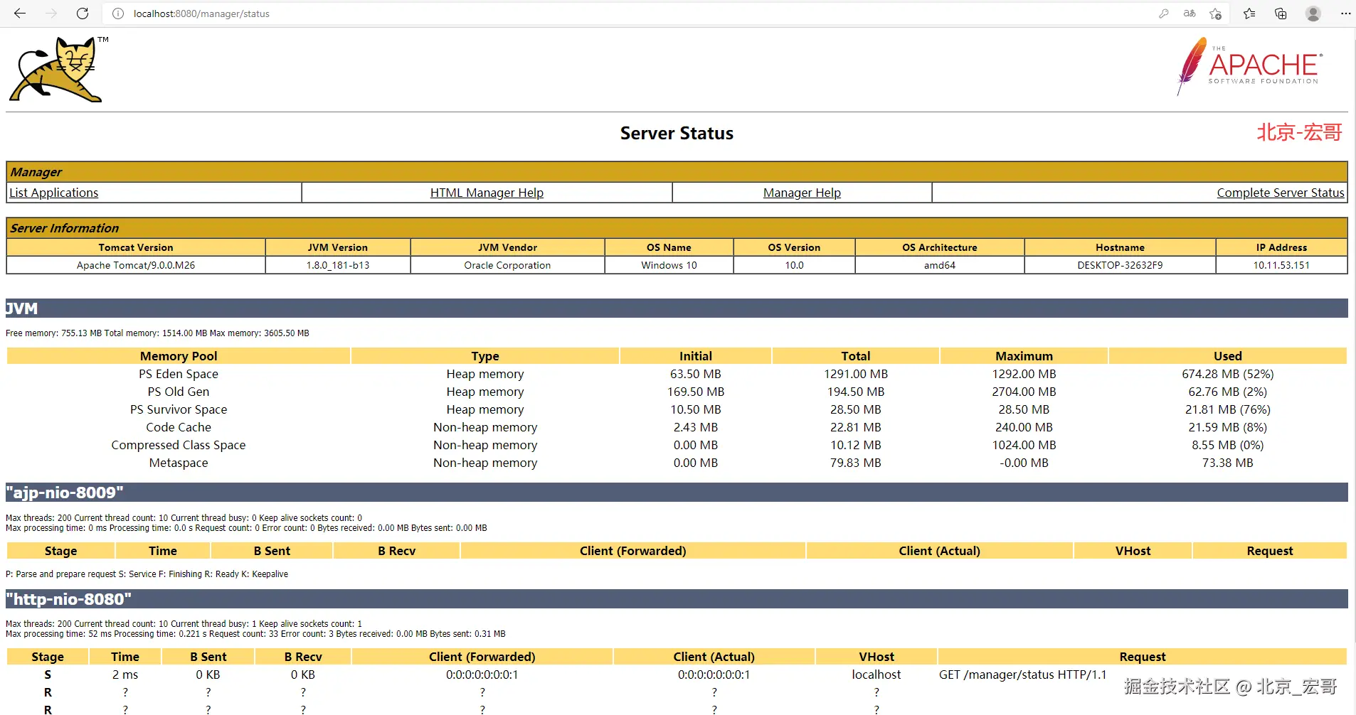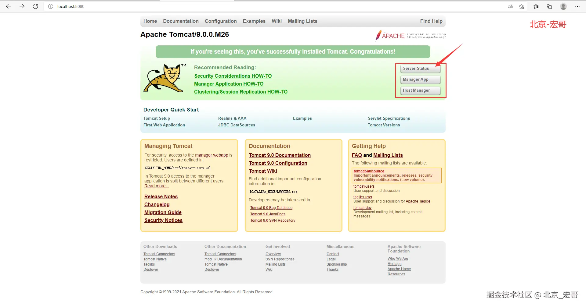 5、重启Tomcat生效。输入相应用户名密码即可使用Server Status、Manager App、host-manager功能。